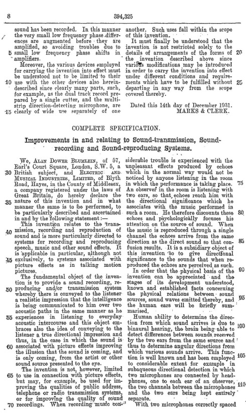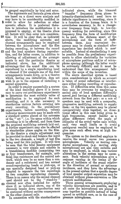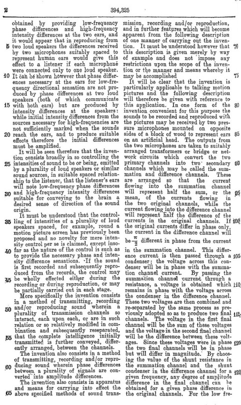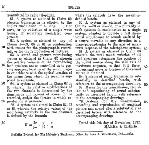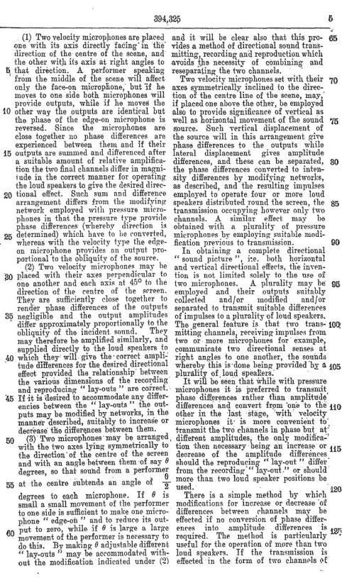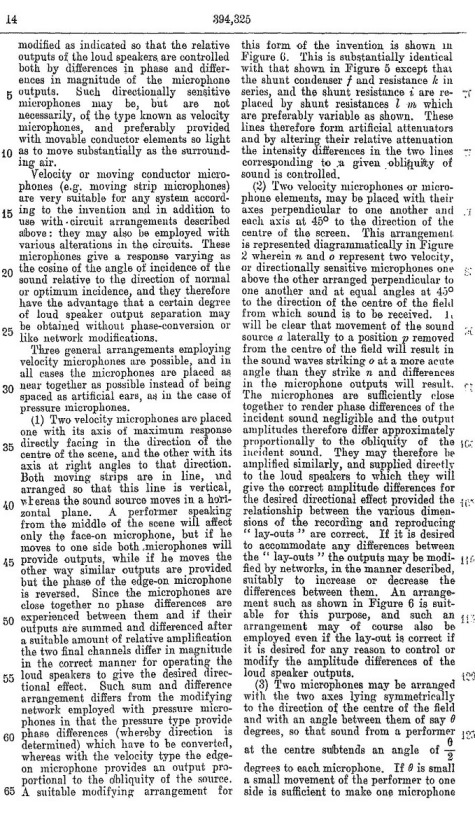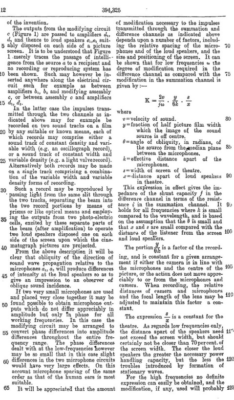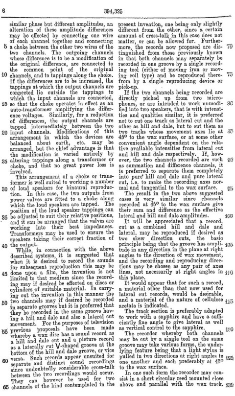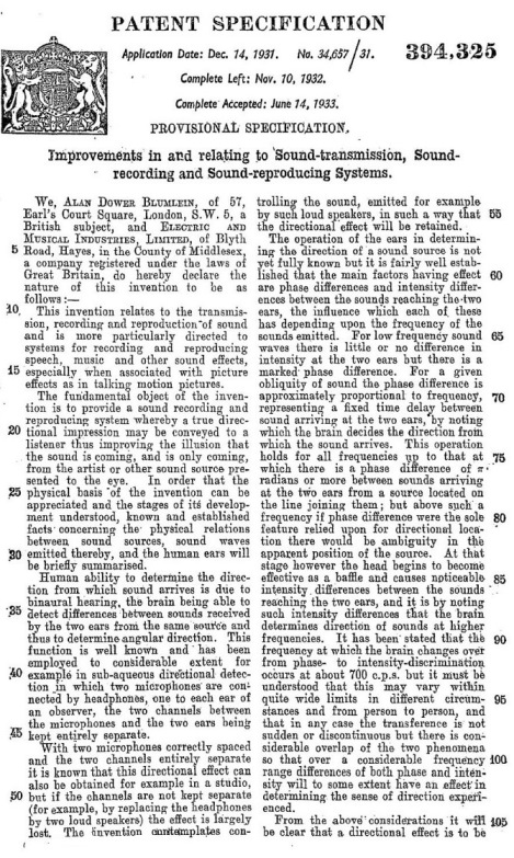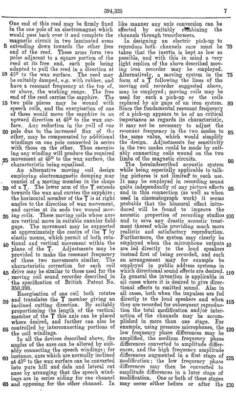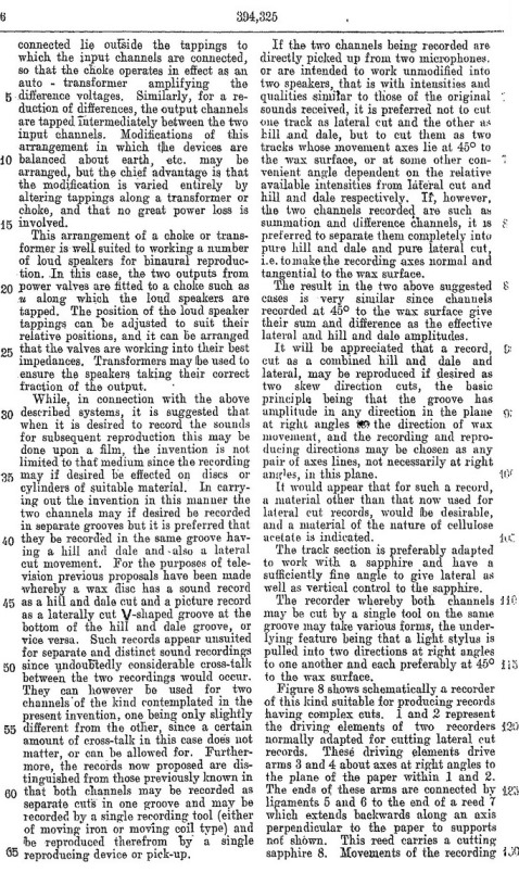 Blumlein's Historic PATENT SPECIFICATION. No: 394,325