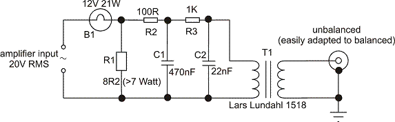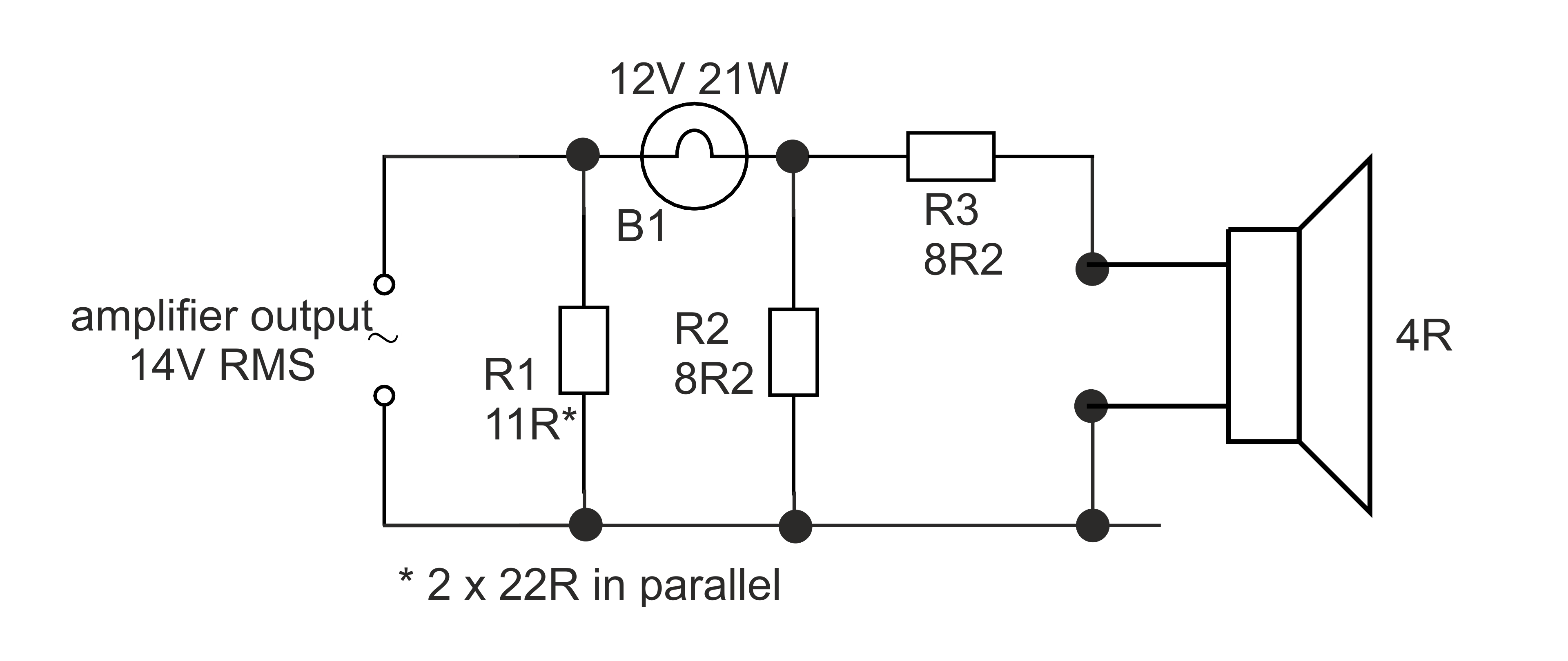 In use, the amplifier power is adjusted so that the bulb just burns brightly on absolute signal peaks. Do not overdrive the circuit because it is possible to over-run and destroy the bulb. This is fail-safe, in the sense that the signal path is broken, thereby protecting any downstream electronics. However, care should be exercised, especially with valve amplifiers which do not like operating into an open circuit.
