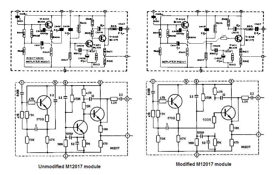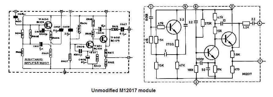 In the end, I decided on a very simple modification which is illustrated below. As you can see, the two-transistor stage is simply transformed into a straightforward emitter-follower; the connections to the tone-controls and any interfering circuitry being broken. The details of the modification to BOTH of the amplifier M12017 amplifier modules are as follows: Remove C402, remove R409 and remove TR401. Connect the "upstream" end of the removed C402 to the base of TR402 with 100R resistor.