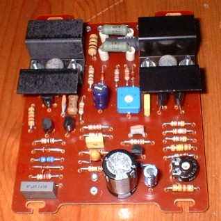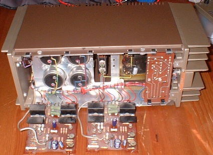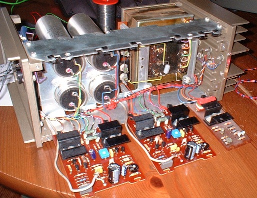 De-soldering the harnesses wasn't difficult. Once the new modules were fitted, the regulator volts needed to be re-tweaked to 67V and the bias current needed setting to ≈ 10mA by measuring 3mV across one of the emitter resistors in the output stage. The next picture shows the new modules fitted.