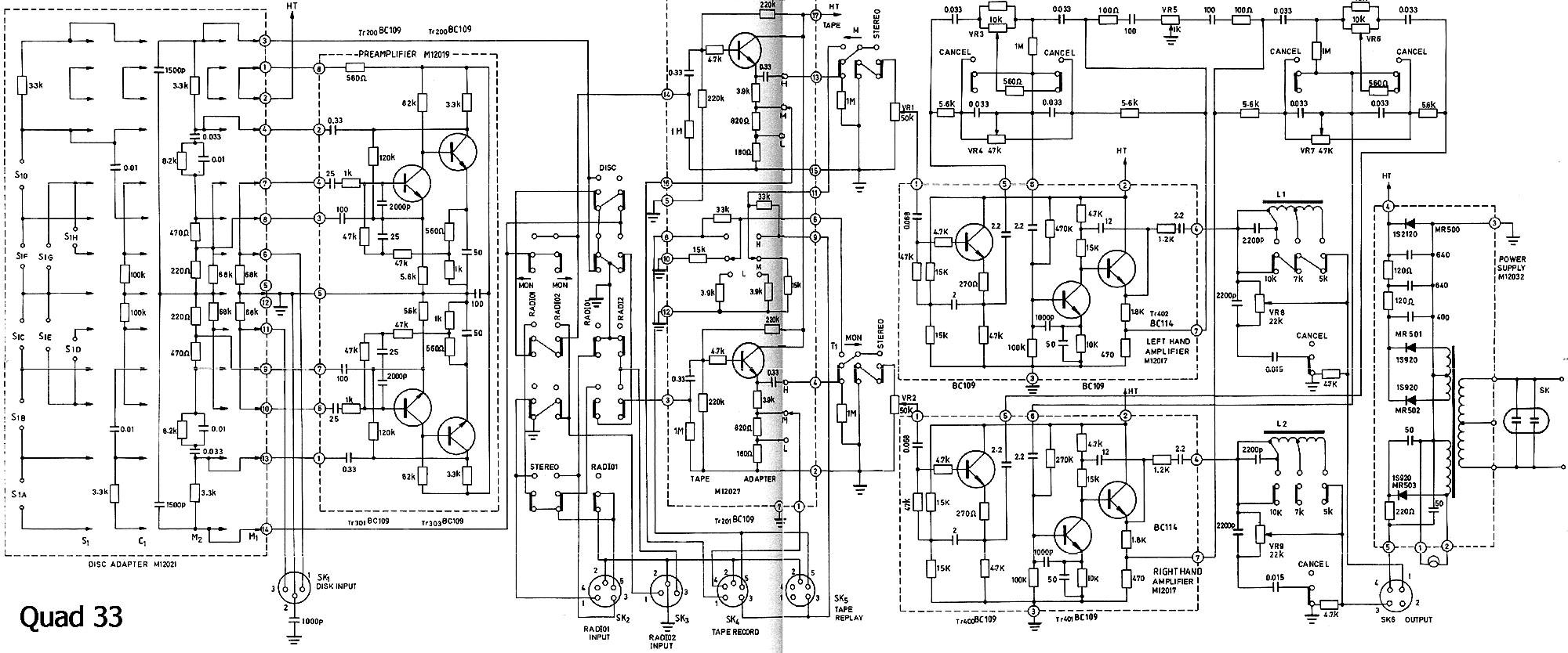 The Quad 303 represents a high point in the early epoch of transistor amplifier design. True, it is a single rail design, and therefore relies on an output coupling capacitor; a component that compromises LF performance to some degree. Nevertheless, the design has stood the test of time and still gives an excellent performance; even by today's standards. The Quad 33 pre-amplifier does not enjoy a continued respect and loyal support that its stable-mate the Quad 303 power amplifier enjoys. Firstly, the pre-power combination has far too high a gain for modern digital signal sources and this tends to make the Quad 33 a noisy partner to its relatively silent power-amplifier companion. Furthermore the tone-controls on the Quad 33 (with the exception of the very fine variable-slope LC low-pass filters) are unfashionable and involve some design compromise being based on a high-gain transistor pair amplifier. Having recently bought a Quad 33 and 303 pair, I looked at ways of improving the 33 so that I could continue to use it as the partner to the Quad 303, without having to accept any compromise in performance. The results have wrought an enormous improvement and are given below. I believe therefore, that my experiences may be of interest to any other fans and users of this classic Quad equipment.