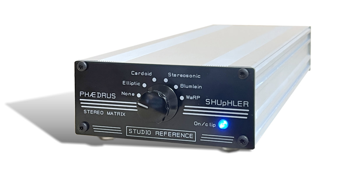 The Phædrus Audio SHUpHLER-IV stereo processor offers new and old treatments for stereo microphone and panned-stereo signals. The SHUpHLER-IV builds on the success of the previous SHUpHLERs and adds new processes: the famous Elliptical equaliser due to Neumann as used in the EE66 and EE70 lathe electronics; and the Wavefront Reconstruction Processor (WaRP) that was previously only available in the FRANCINSTIEN WaRP-III processor.