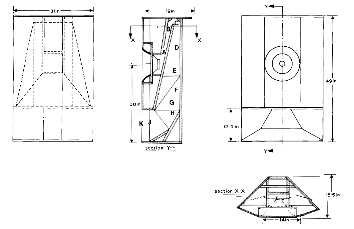 The quotation is from a short series of articles by Jack Dinsdale, (Horn loudspeaker design. Dinsdale, J. Wireless World March, May, June 1974) which is still considered to be an excellent synthesis of the work on horn loudspeakers, some of it from way back at the beginning of the 20th century. It is required reading if you are seriously interested in the field. Dinsdale works through two example designs which have gone on to have lasting influence on the design of practical horn loudspeakers for home use. Even the Pnoe loudspeakers illustrated above which embody contemporary design aesthetics clearly distant from England of the 1970s, reveal a strong engineering debt to Dinsdale's mini-horn design of fifty years ago (below).