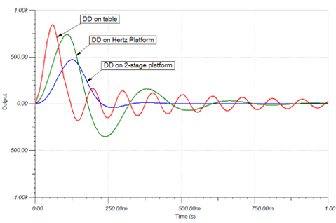 The traces below are simulations of the cartridge signal as a result of shocks as the stylus rests on the record with a direct-drive turntable (Technics SL-1200 Mk. 2) on a solid table; a direct-drive turntable on the Hertz platform; and the turntable on a two-stage platform, inspired by Olson's instrument support.